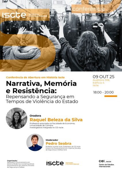 The guest speaker is Raquel Beleza da Silva, Associate Professor at the Faculty of Economics of the University of Coimbra and Integrated Researcher at CEI-Iscte, with the theme ‘Narrative, Memory and Resistance: Rethinking Security in Times of State Violence.’