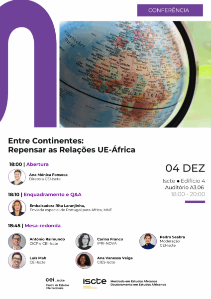 No dia 4 de dezembro, às 18h, terá lugar, no Auditório 306 do Edifício 4 (Iscte), o evento “Entre Continentes: Repensar as Relações UE-África”, dedicado à reflexão sobre os desafios e dinâmicas que moldam as relações entre a União Europeia e o continente africano.