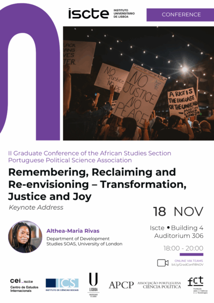 A Keynote Session contará com a participação de Althea-Maria Rivas (SOAS, University of London), que apresentará a conferência intitulada “Remembering, Reclaiming and Re-envisioning – Transformation, Justice and Joy”.